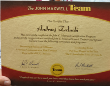 Jestem certyfikowanym mówcą i trenerem „The John Maxwell Team”. John Maxwell jest autorem kilkudziesięciu książek z dziedziny przywództwa, a jego organizacje na cały świecie edukują przedsiębiorców w dziedzinach związanych z prowadzeniem biznesu.